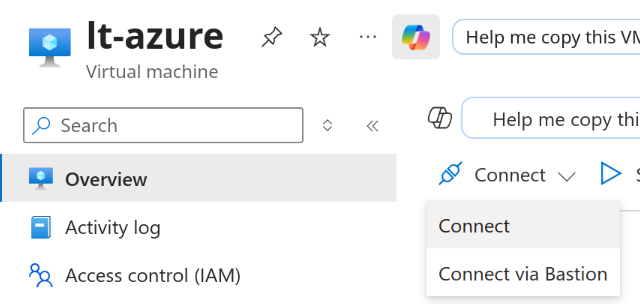 Go to the Overview page of your virtual machine instance, click Connect → Connect, and follow the instructions to establish an SSH connection to the host operating system using your downloaded private key.